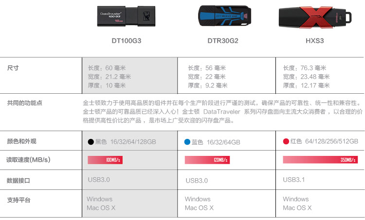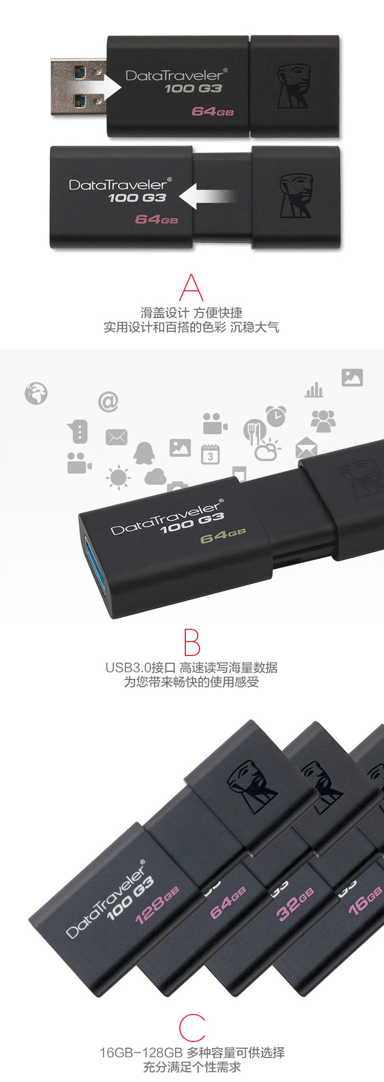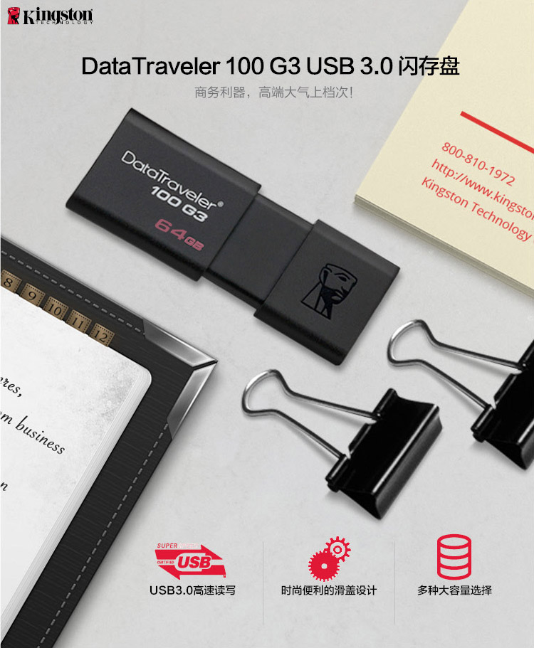 金士顿(Kingston)DT100G3 64GB USB3.0 U盘 黑色 商务滑盖 高速便捷