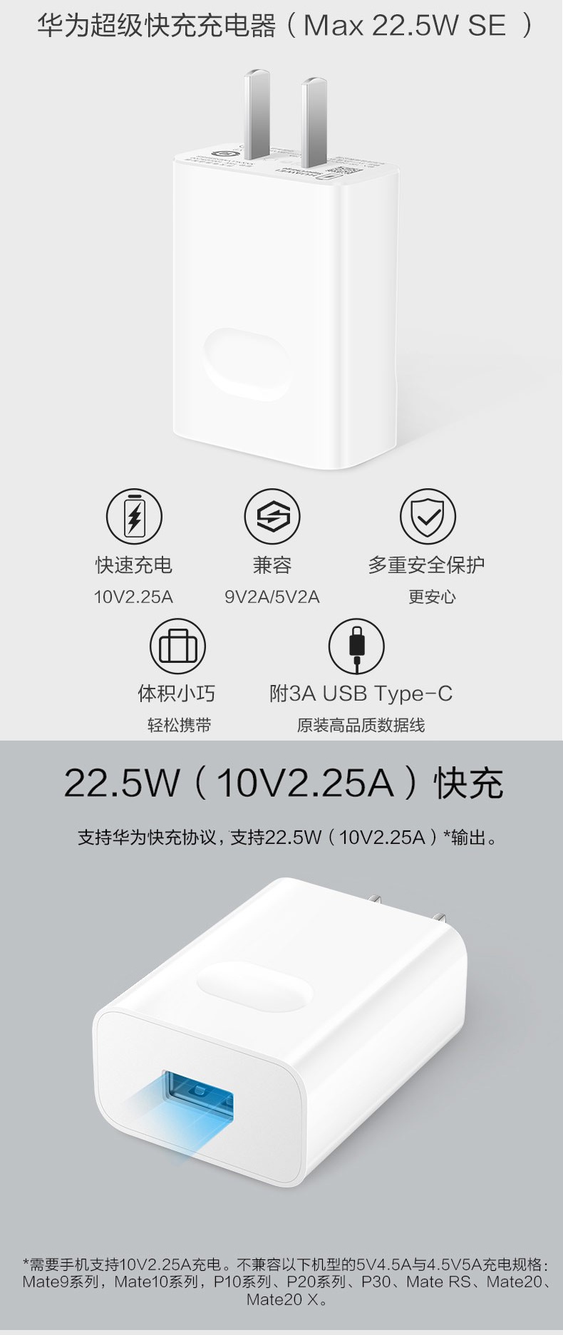 华为超级快充充电器(Max 22.5W SE)10V2.25A 智能兼容/多重安全保护/附Type C原装数据线 套装