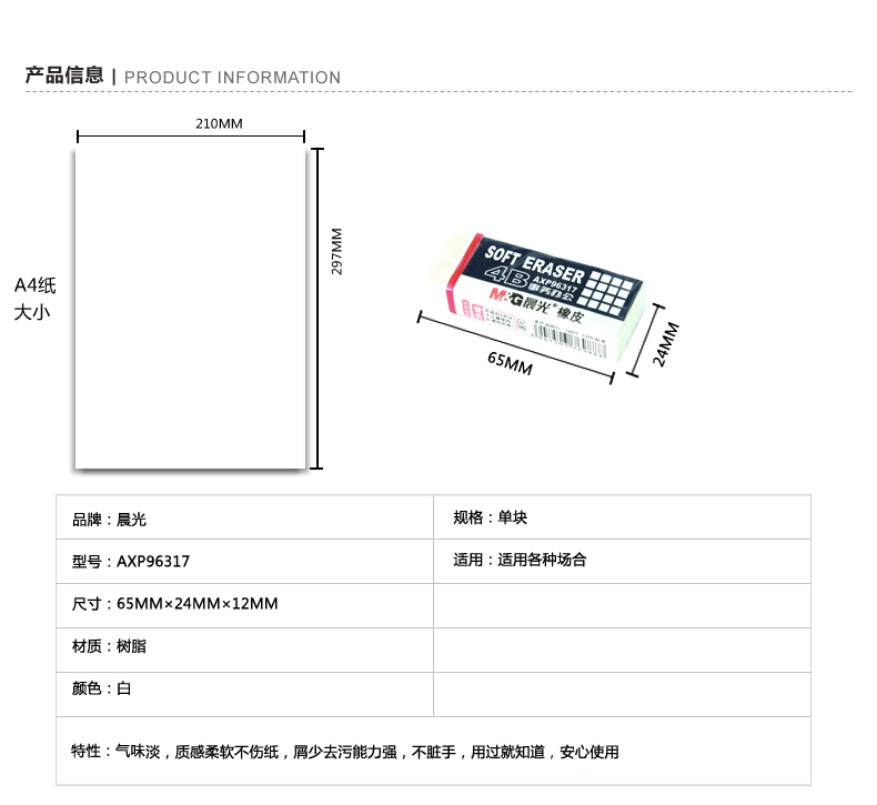 晨光(M&G)AXP96317 4B橡皮30个/盒 65*24*12mm橡皮擦 办公学生美术绘图写字素描用 橡皮 白色