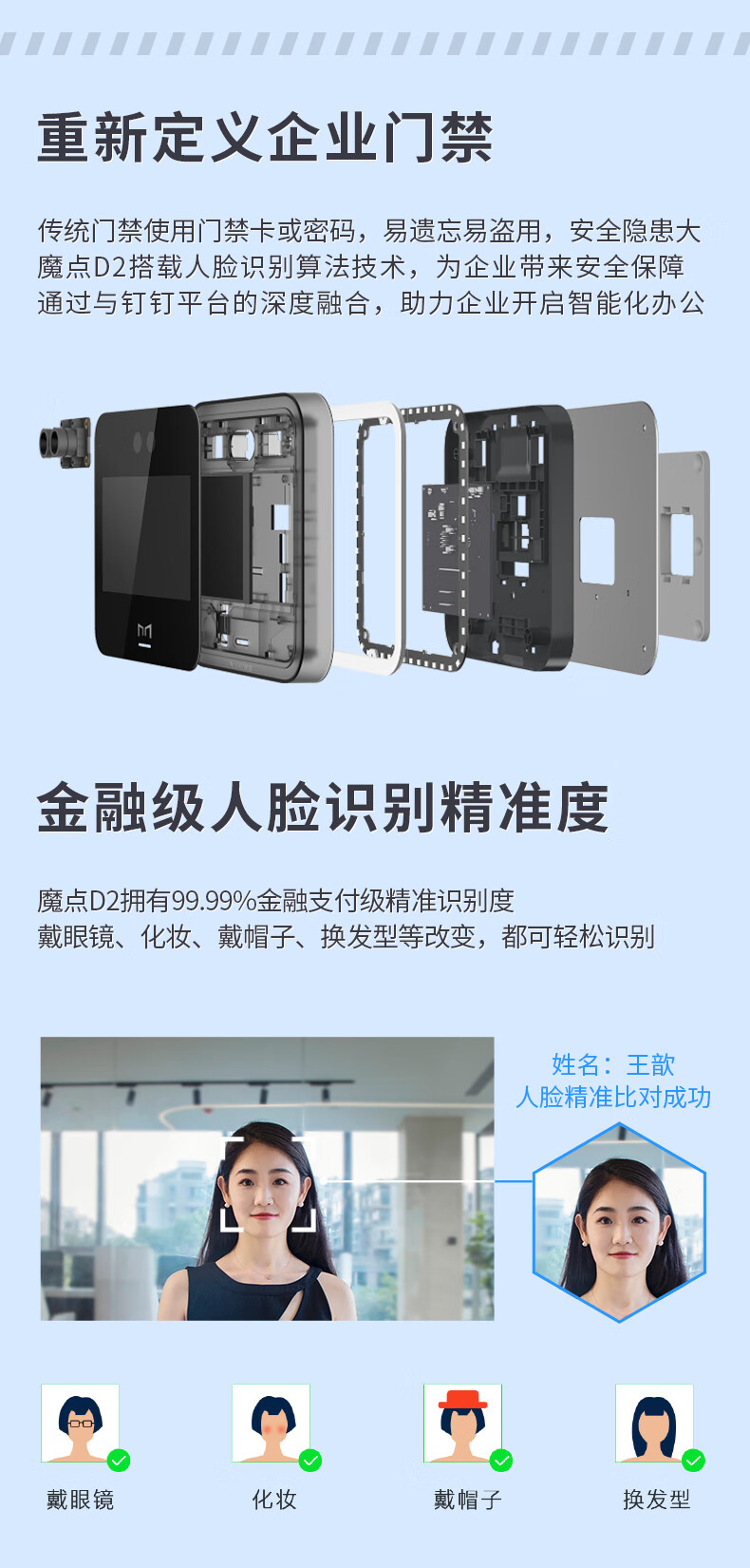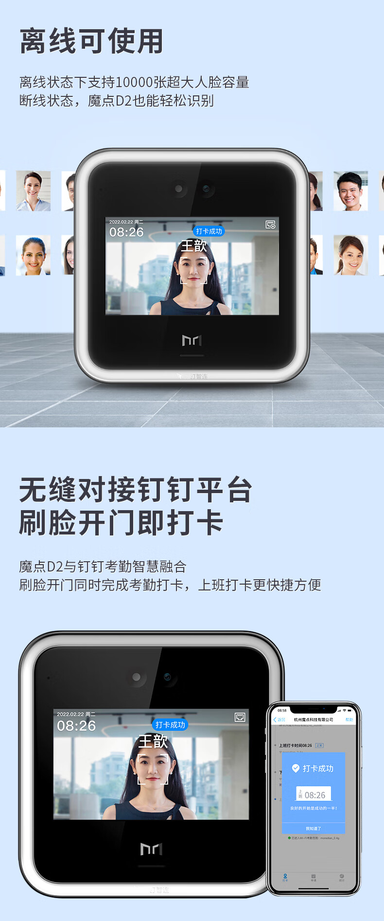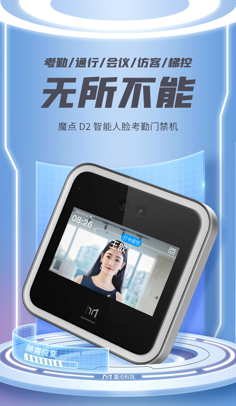 魔点 D2智能人脸云考勤门禁机钉钉动态人脸识别非指纹玻璃门禁系统办公室刷脸测温门禁锁签到打卡机一体机 D2主机(不含门禁配件)
