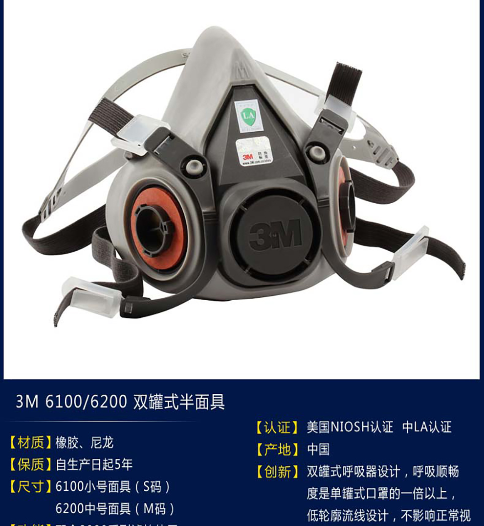 3M 6200防尘面具6100防颗粒物2091 2096 2097防酸性气味有机气体口罩 小码6100配2096防尘面具