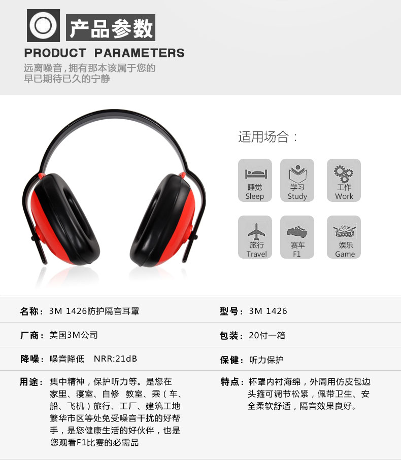 3M 1426舒适型隔音耳罩 降噪防护 防噪音隔音耳机 工厂学习睡眠打呼噜用