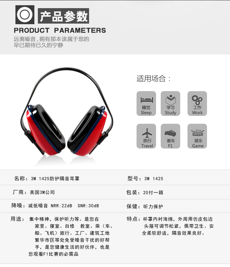 3M隔音耳罩 防噪音睡眠学习工业防护耳罩射击降噪架子鼓消音 3M1425隔音耳罩