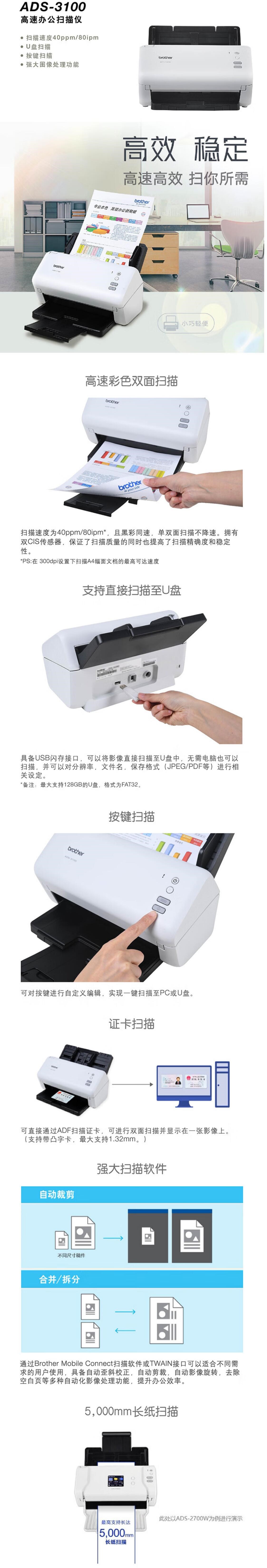 兄弟(brother)ADS-3100 扫描仪 40ppm/80ipm U盘扫描 高速双面办公文档双面扫描仪