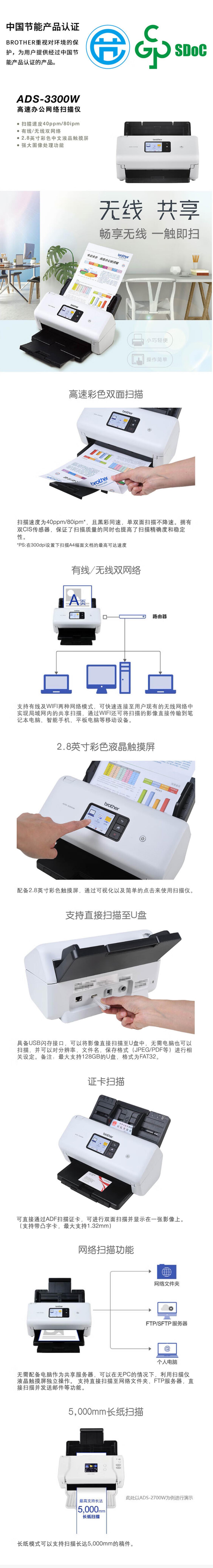 兄弟(brother)ADS-3300W 双面A4馈纸式高清高速扫描仪 无线WIFI有线网络共享 触摸屏U盘可脱机 发票扫描仪