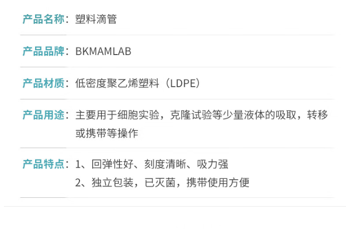 比克曼生物(BKMAM)一次性塑料滴管吸管独立无菌带刻度巴氏化妆品喂鱼滴管实验室宠物通用加厚软管 【独立包装】60ul双囊定量 120支/包