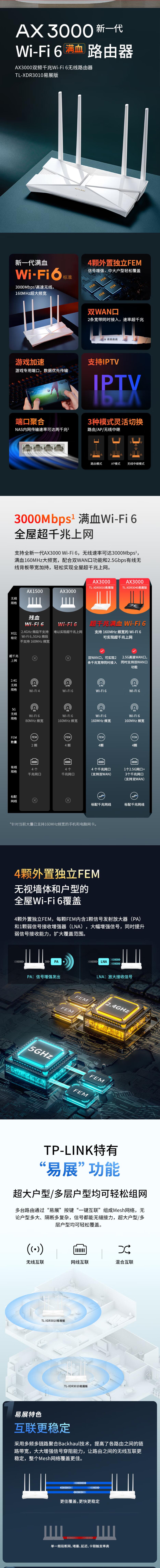 TP-LINK 大道AX3000满血WiFi6千兆无线路由器 5G双频 Mesh 3000M无线速率 支持双宽带接入 XDR3010易展版