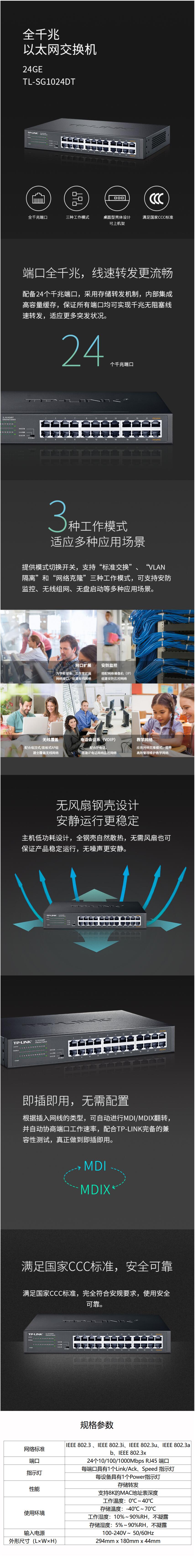 TP-LINK 24口全千兆交换机 非网管T系列 企业级交换器 监控网络网线分线器 分流器 TL-SG1024DT