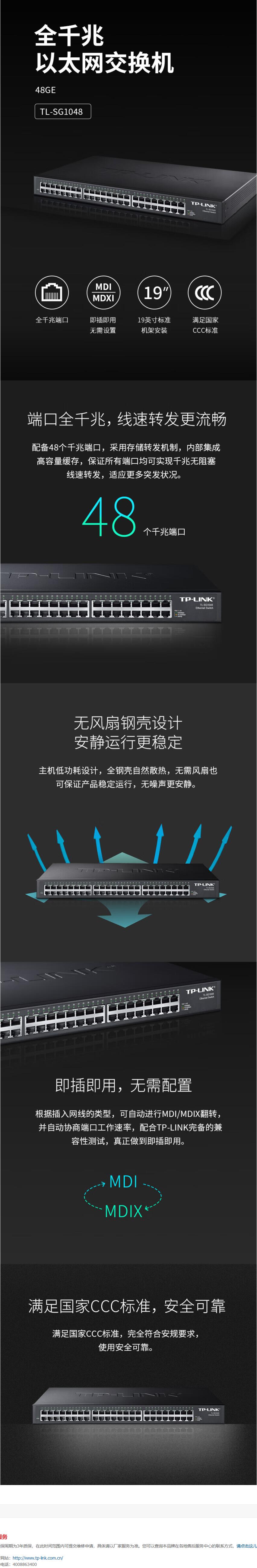 TP-LINK 48口全千兆非网管交换机 企业级交换器 监控网络网线分线器 分流器 TL-SG1048