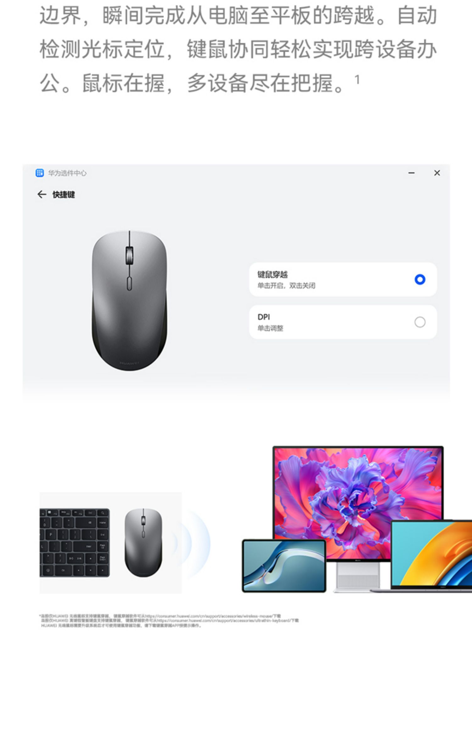 键鼠穿越、舒适握感、靠近发现连接、无线蓝牙双模、玻璃表面流畅使用