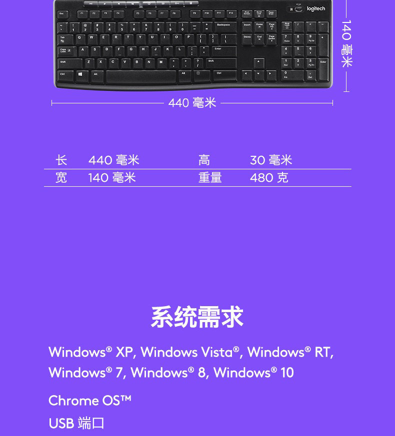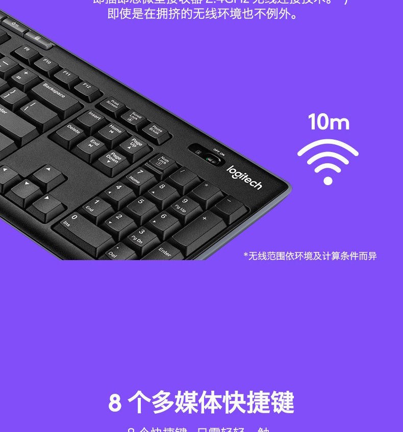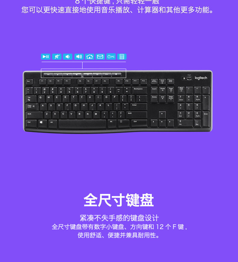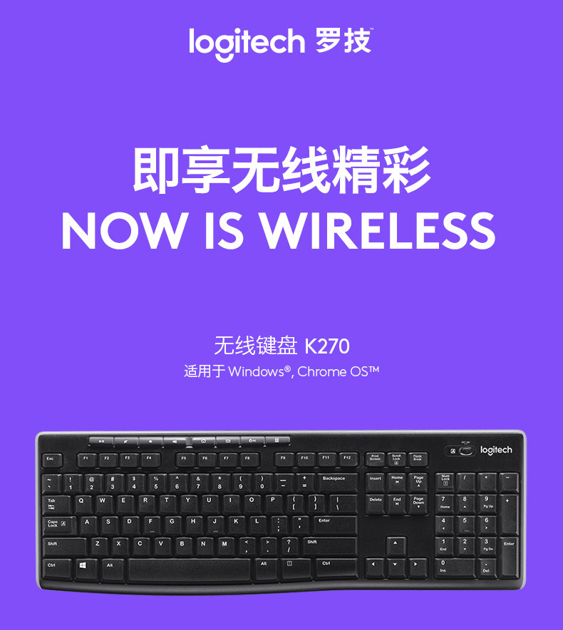 罗技K270 键盘 无线键盘 办公键盘 优联 笔记本键盘 全尺寸 黑色