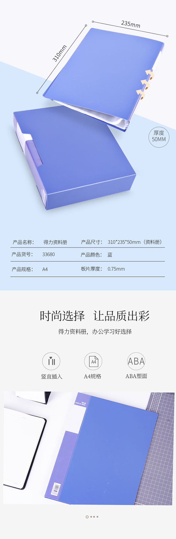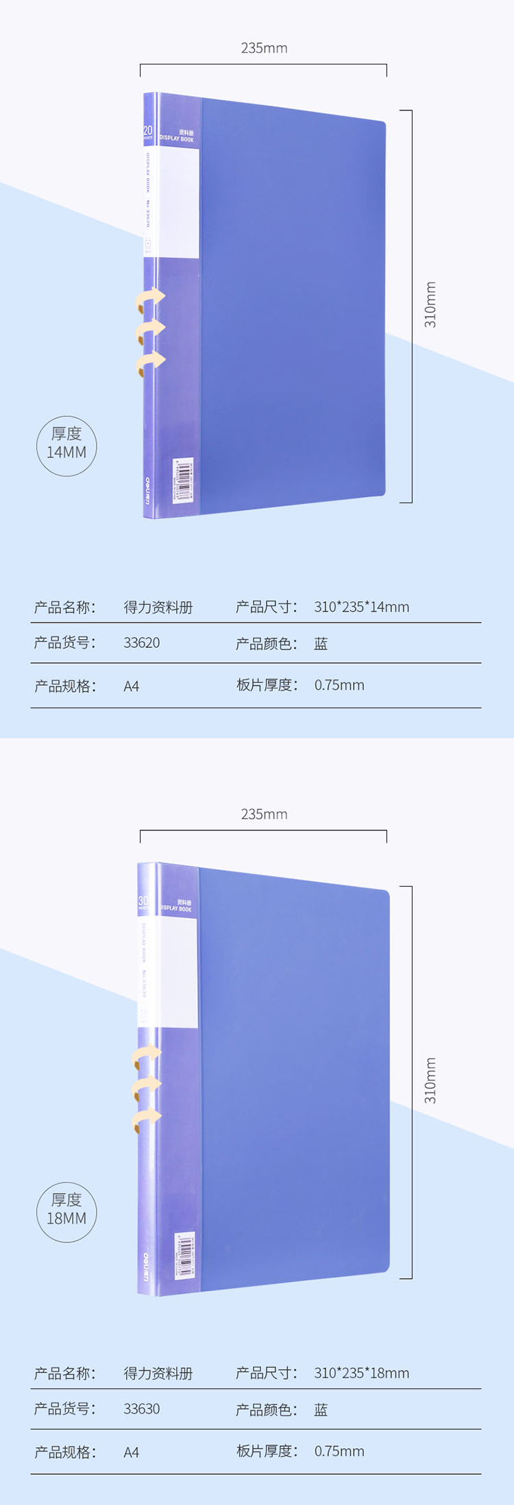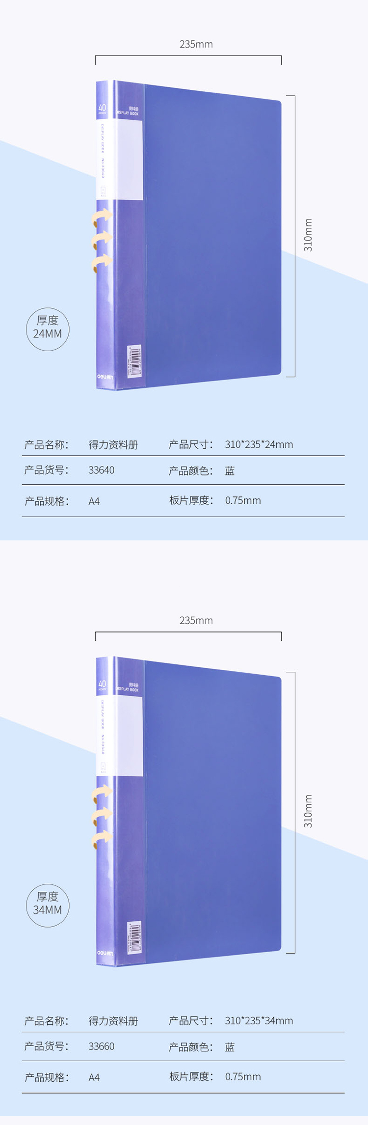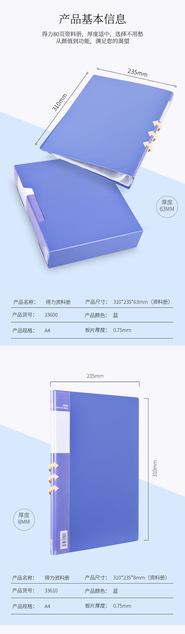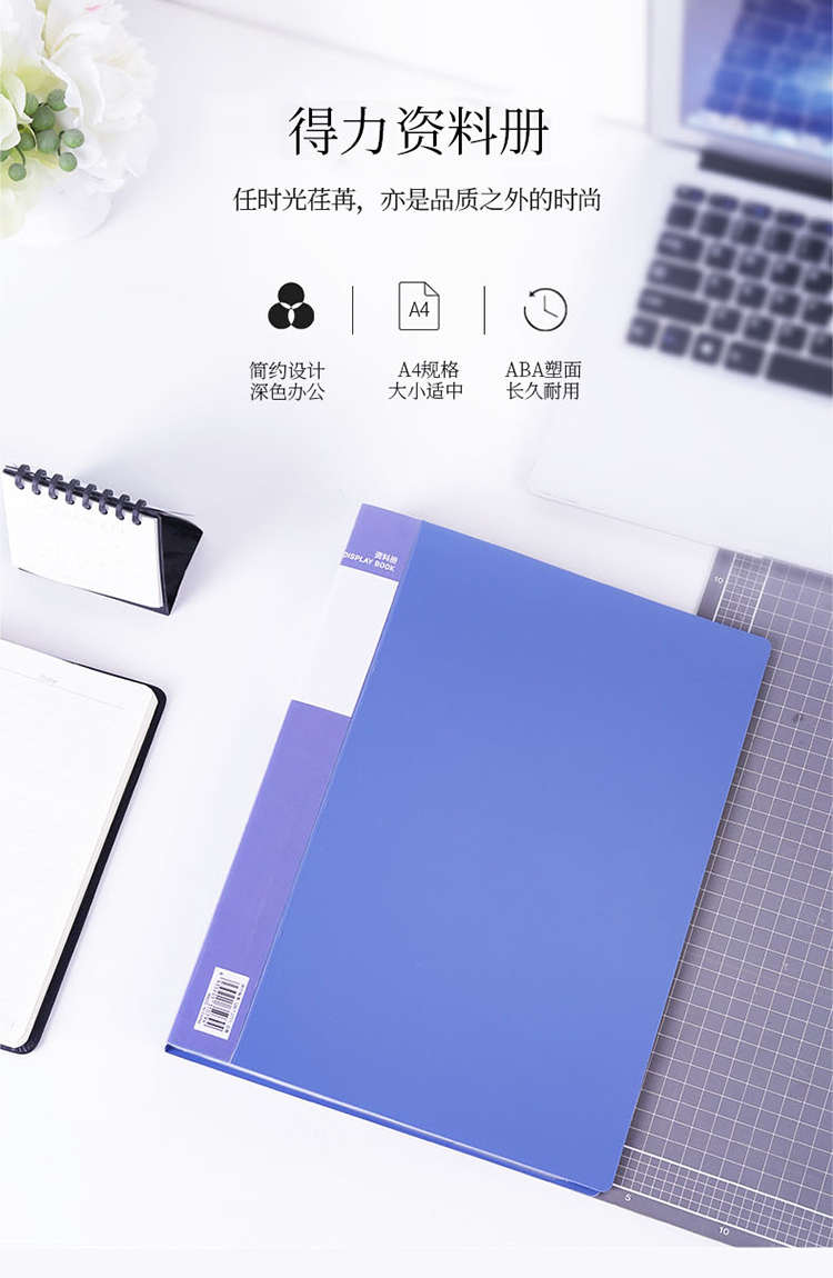 得力(deli)33680 80页资料册2册 A4开口资料册 文件夹插页袋 试卷档案册 办公文件资料收纳 办公用品 蓝色