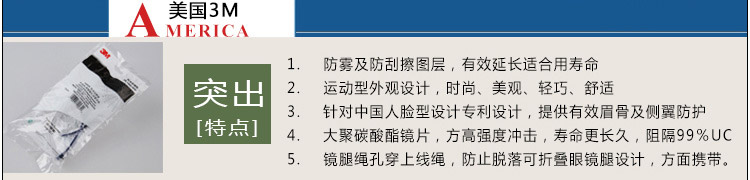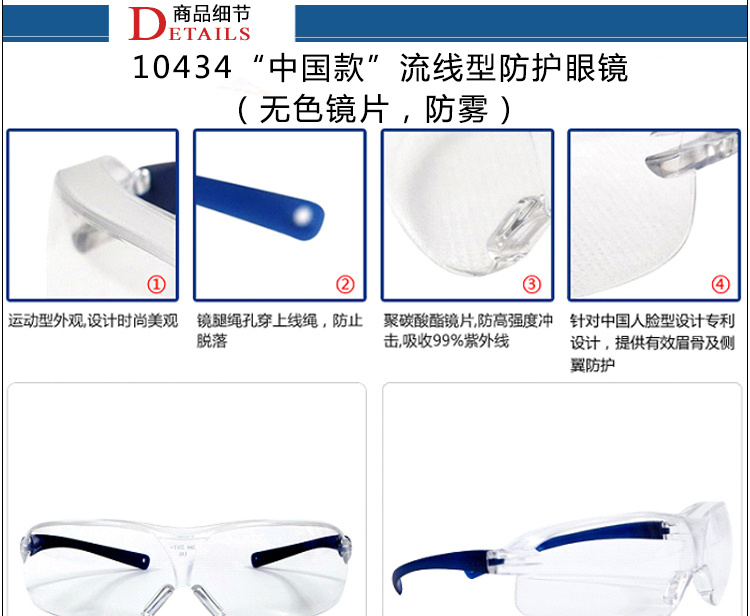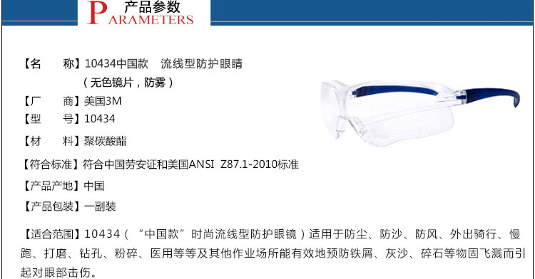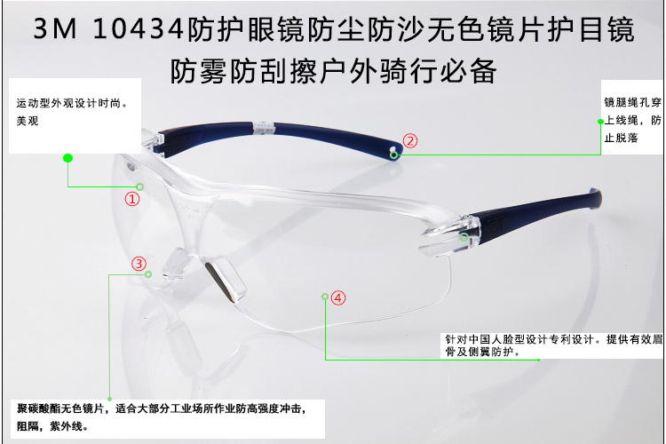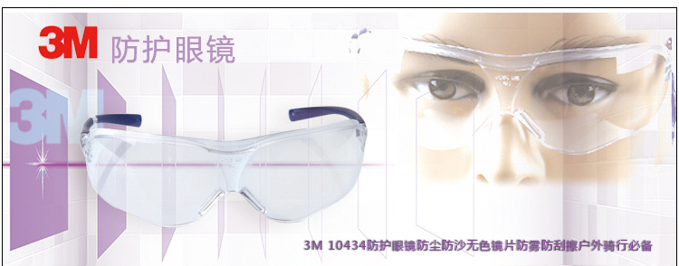 3M 10434 防护眼镜 防风沙防雾男女骑行劳保护目镜 透明流线型工业眼镜 运动眼镜