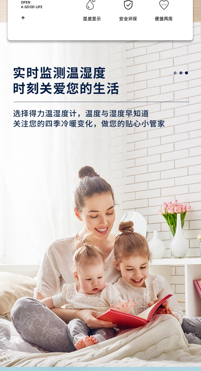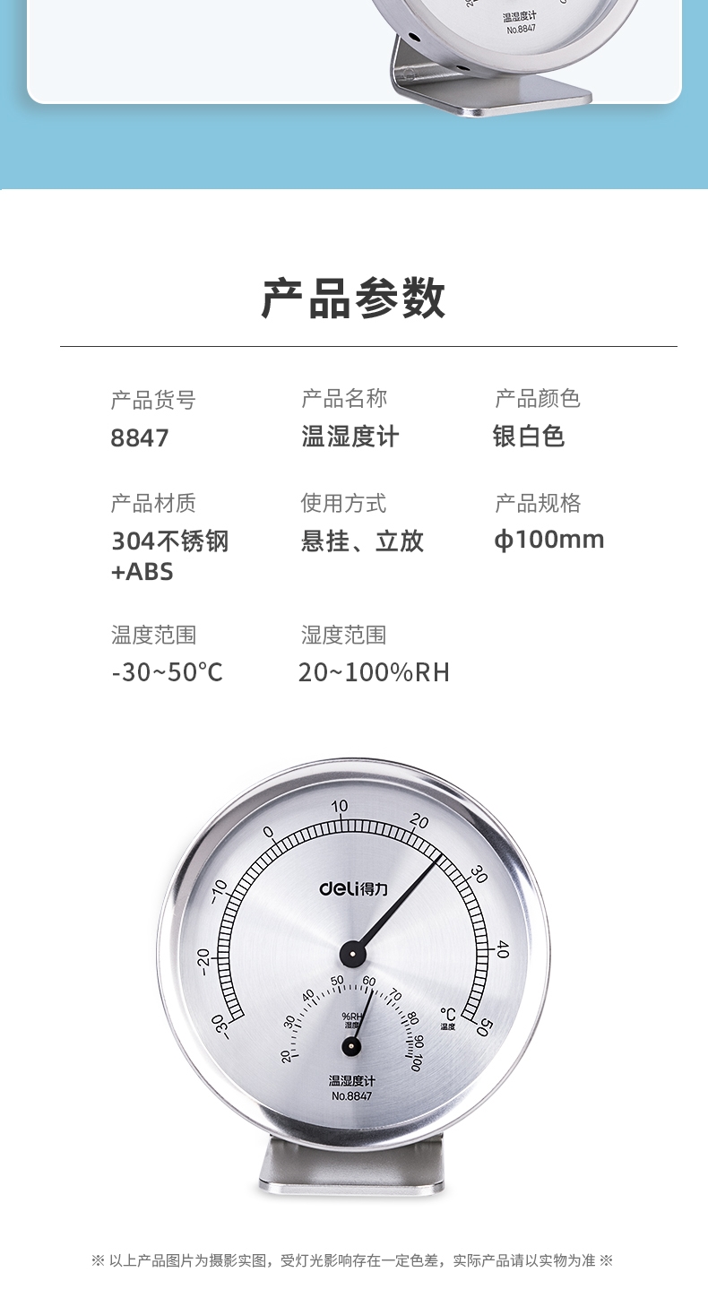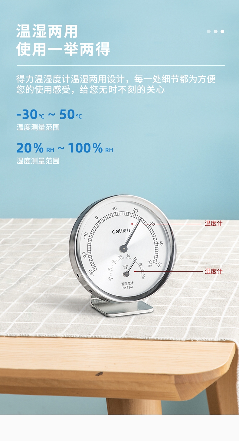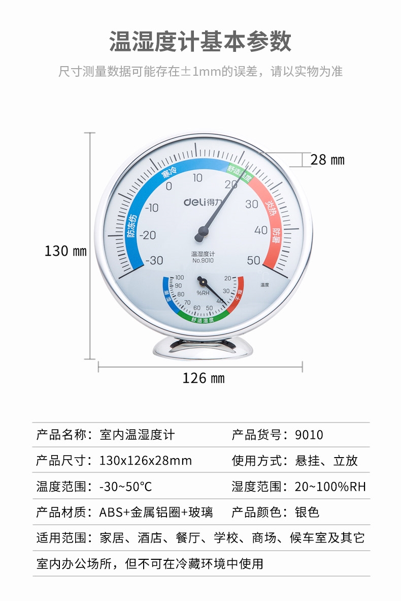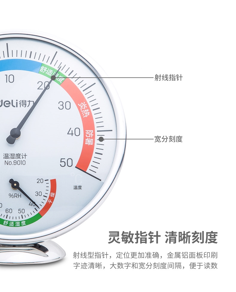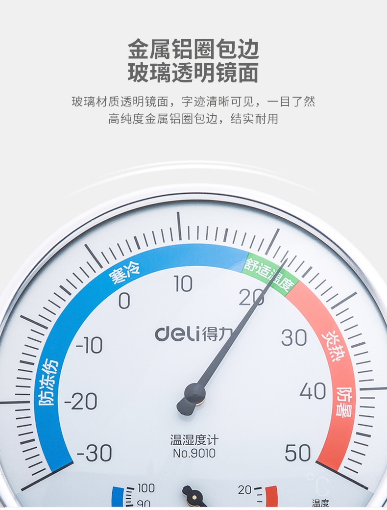 得力温湿度计办公室家用室内外两用干湿测温表时尚温度计婴儿房 中号表盘直径88mm铝合金-9011